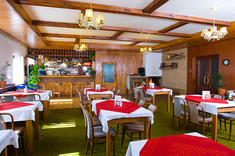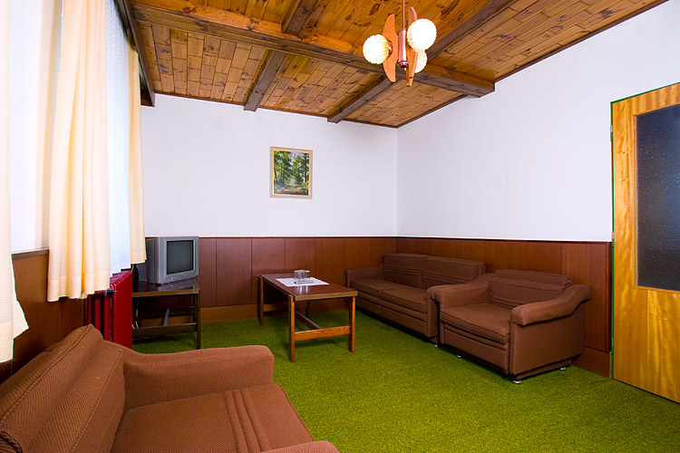 Velká společenská místnost, která slouží jako jídelna a restaurace pro ubytované hosty s celkovou kapacitou 40 míst. Menší salonek také s televizorem, je vyhrazen především pro kuřáky.